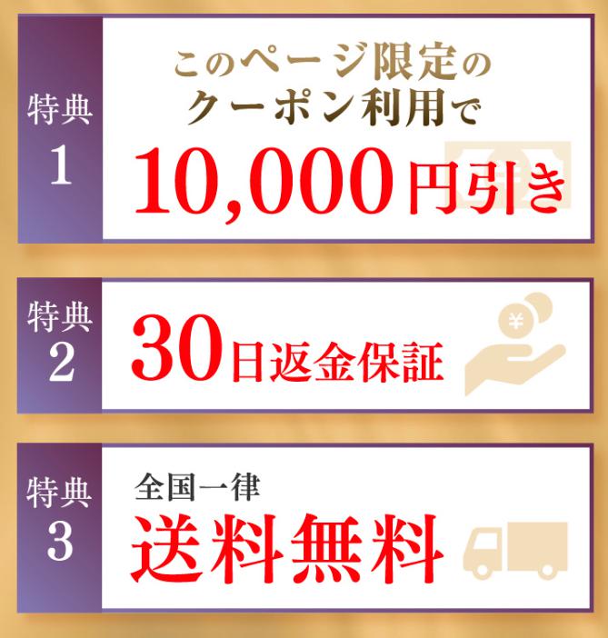 今なら10,000円引き&30日返金保証&全国送料無料の3大特典付き