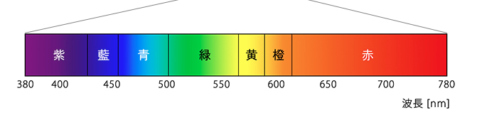 個人差もありますが、「可視光」(目に見える光)の波長範囲は、だいたい360nm~830nmの間とされています。